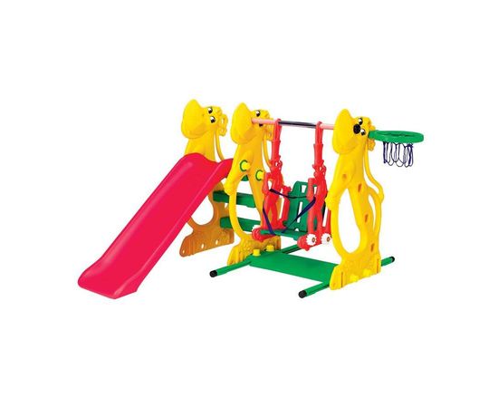 Горка-комплекс состоит из непосредственно горки, качелей и баскетбольного кольца. С таким сооружением можно придумать множество различных развлекательных игр. Кроме того можно организовать даже целые турниры по баскетболу. Благодаря тому, что размеры комплекса относительно небольшие (1,6*1,77*1,1), то такую конструкцию можно установить даже дома, не говоря уже о маленьких площадках во дворе.