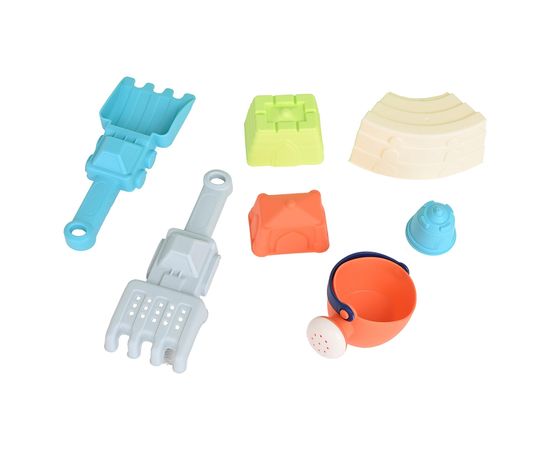 В наборе 4 формочки для песка, лопатка- 1 шт, грабельки-1 шт., мельница-1 шт, лейка-1 шт.