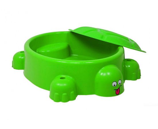 Песочница-бассейн, выполненная в виде черепахи с фигурными лапками и головой, может быть наполнена и водой, и песком. Для удобства игры в ней предусмотрены два выступа-сидения (в голове и хвосте черепашки). Есть отверстия для солнцезащитного тента.