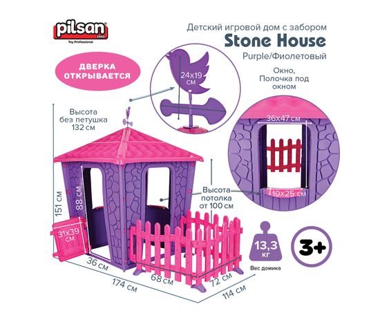 PILSAN Детский игровой дом Stone House с забором,Purple/Фиолетовый,114*174*151 см
