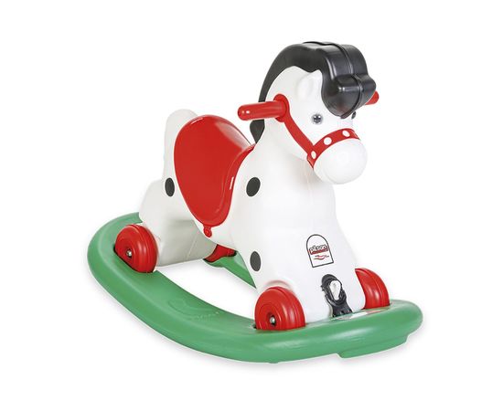 Также качалка-каталка оснащена специальными блокирующими выступами на поддоне, защищающими от опрокидывания, формовкой под седло, проигрывателем музыкальных мелодий, удобными ручками на голове лошадки, за которые малыш может держаться.