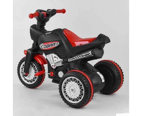 Мотоцикл оснащен 3-мя литыми большими колесами, в передней части корпуса рулевая колонка украшена фарой и удобным широким рулем. Резиновые грипсы выполнены с рельефными узорами, которые предотвращают соскальзывание ладони с руля во время катания.