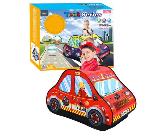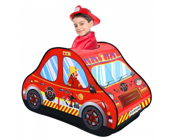 Детская палатка выполнена в форме пожарной машинки и имеет самораскладывающийся каркас-спираль.
