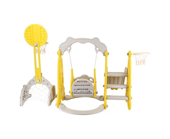 Комплектация: пластиковая горка, качели, лесенка, кольцо баскетбольное (2 шт.), ворота.