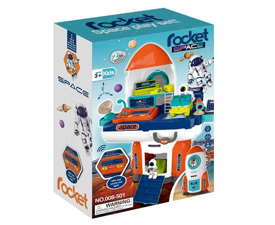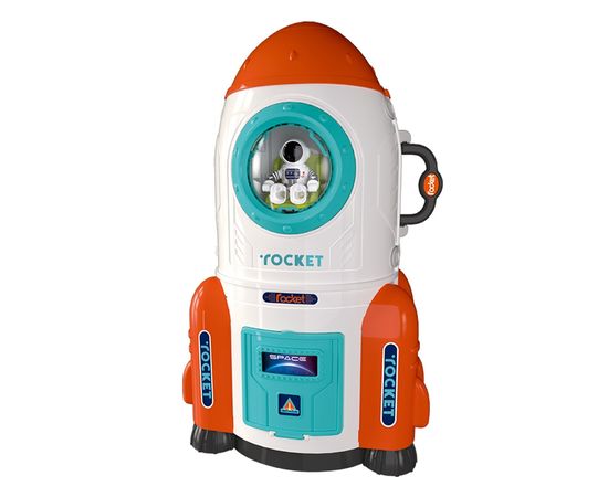 В игровой набор входит: Космическая ракета - 1 шт., луноход с колесами (можно играть отдельно) - 1 шт., фигурка космонавта - 2 шт., тематические предметы-9 шт.