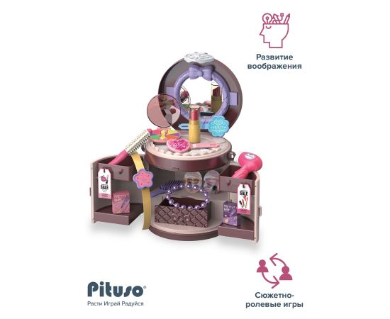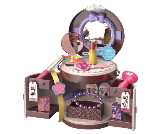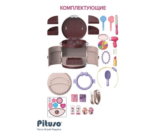 В комплекте: База (основа)-1 шт., зеркало (имитация)-1 шт, фен (имитация)-1 шт., расчестка-2шт.,ремешок-1 шт., украшения и элементы косметики - 14 шт.