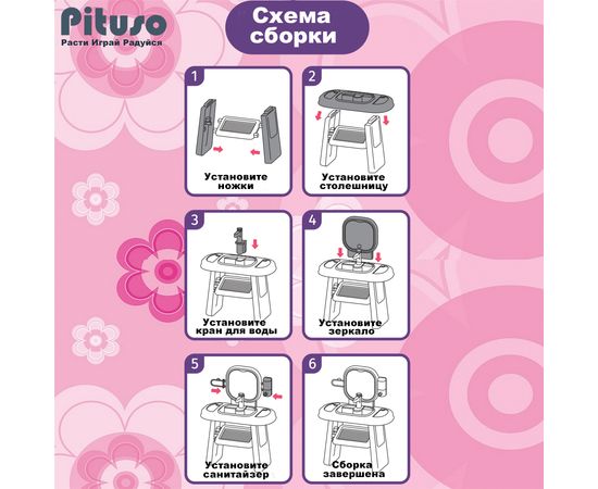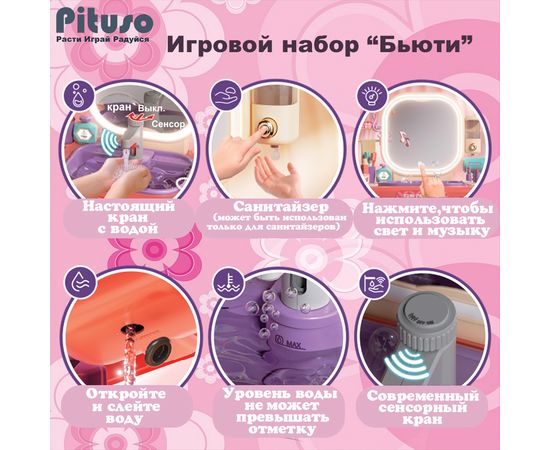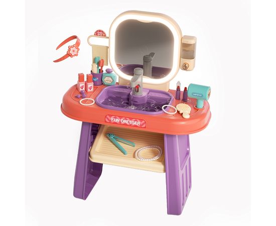 Оригинальный игровой набор состоит из пластмассового столика с мойкой и полочкой, а также большого зеркала с подсветкой.