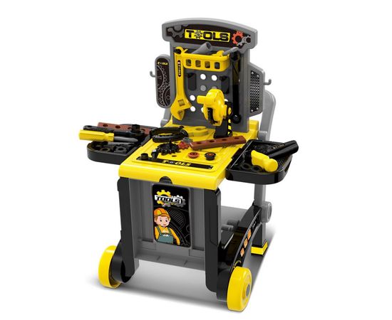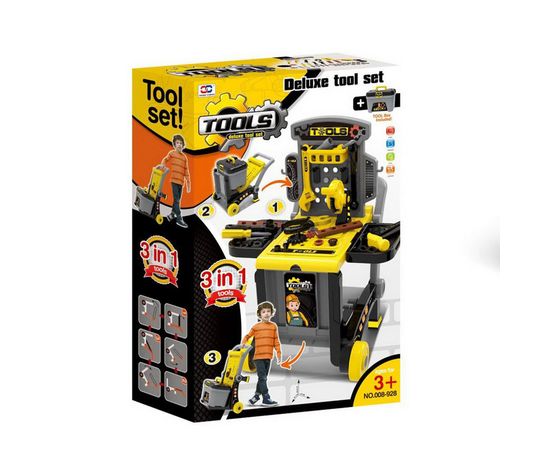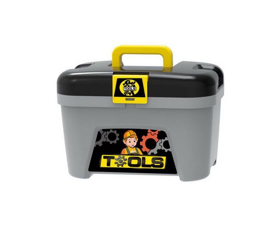 Набор инструментов, который может быть сложен в ящик с ручкой для переноса или на колесиках. Его удобно брать с собой, ведь его можно носить в руках или катать за ручку. Юный мастер может прийти в любое место дома и все быстро починить. Ведь в игровом наборе инструментов есть: отвертки, пила, ключи гаечные, шурупчики;