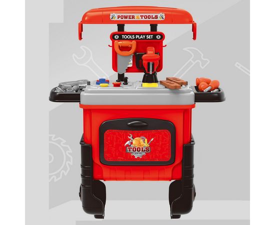 Рабочий стол с отверстиями для крепления винтов, пила, молоток, гаечный ключ, отвертка и другие аксессуары сделают игру юного механика незабываемой.