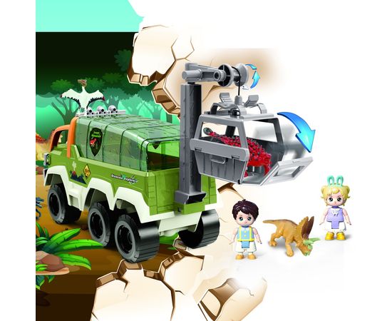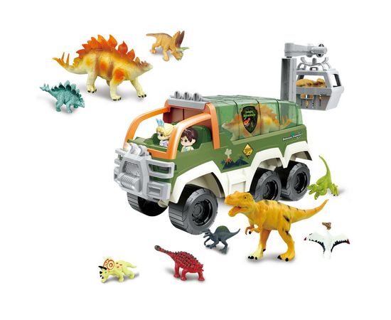 Большой трехосный грузовик создан для погрузки динозавров при помощи штатного манипулятора. Манипулятор оснащен открывающейся кабинкой. Ребенок может открыть дверку кабинки, чтобы поместить туда динозавра и перевести его в безопасное место.