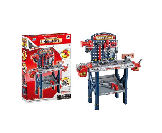 Рабочий стол с отверстиями для крепления винтов, дрель, пила, молоток, гаечный ключ, отвертка и другие аксессуары сделают игру юного мастера не забываемой;