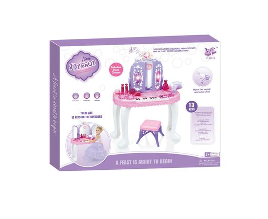 Оригинальный игровой набор состоит из пластмассового столика и удобного пуфика. Дополняет комплект зеркало из небьющегося материала и различные принадлежности для наведения марафета.