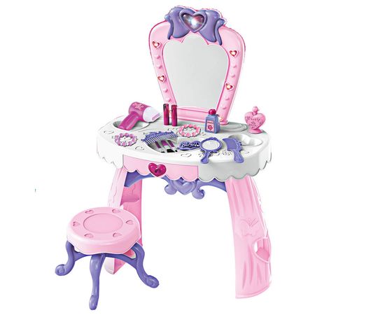 Этот набор понравится каждой маленькой моднице, ведь они так любят изображать из себя мамину копию, которая наводит красоту. Оригинальный игровой набор состоит из пластмассового столика и удобного пуфика. Дополняет комплект зеркало из небьющегося материала и различные принадлежности для наведения марафета. Также в комплект входит красочный фен, издающий интересные звуки.