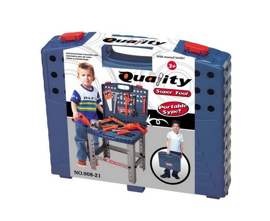В набор входит: дрель (работает от батареек) -1шт., молоток-1шт,ножовка-1шт, ключ трубный-1шт,ключ разводной -1шт,ключ трещетка-1шт, ключ накидной-1шт,штангенциркуль-1шт, отвертка со сменной насадкой-2 шт,пластины-2шт,гайка-16 шт,шуруп-22шт,крючок-держатель-6шт.