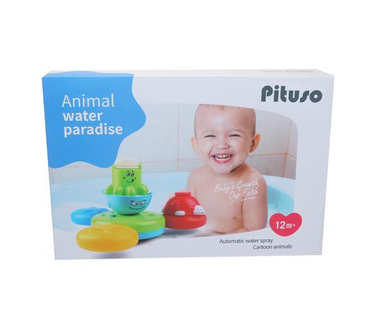 Запустив механизм при помощи кнопки в виде звездочки, малыш будет наслаждаться брызганием и выливанием воды.