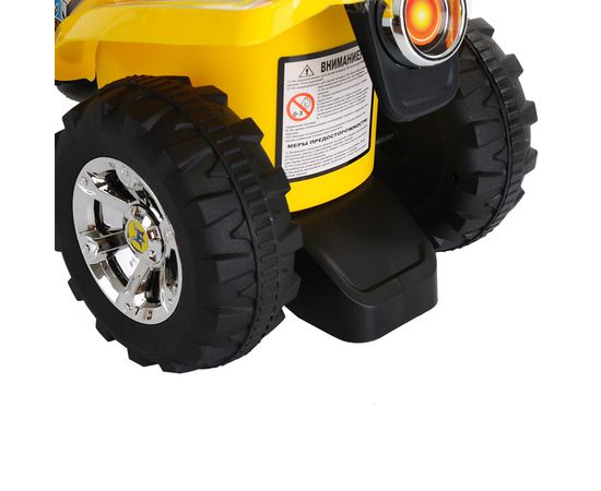 Модель выполнена в форме квадроцикла, имеет большие колеса с рисунком на шинах и просторное сиденье для комфортной посадки. На руле расположены 2 кнопки, которые воспроизводят веселые песенки (батарейки в комплект не входят). Под сиденьем есть вместительный отсек для хранения любимых игрушек. Специальный стопор сзади защитит каталку от опрокидывания.
