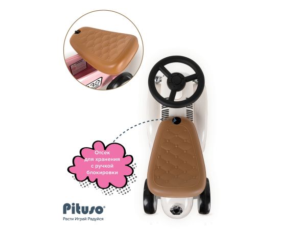 Машина каталка весит всего 2,3 килограмма, и ее легко можно взять с собой на прогулку. Удобное пластиковое сиденье, под сиденьем отсек для хранения. Чтобы открыть отсек для хранения, нужно повернуть ручку блокировки.