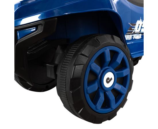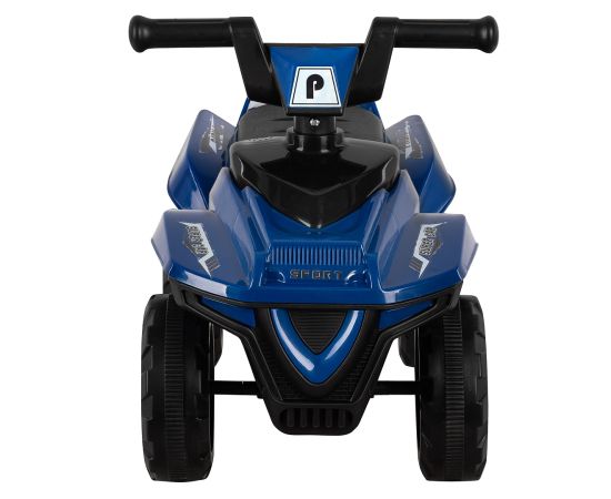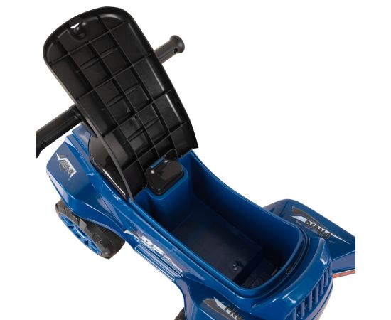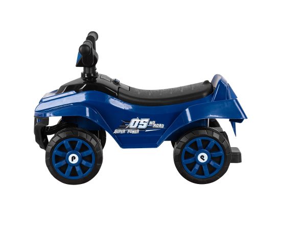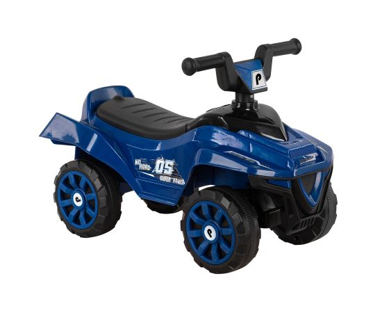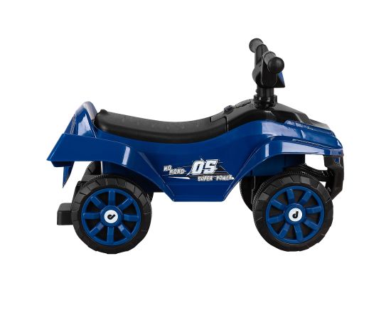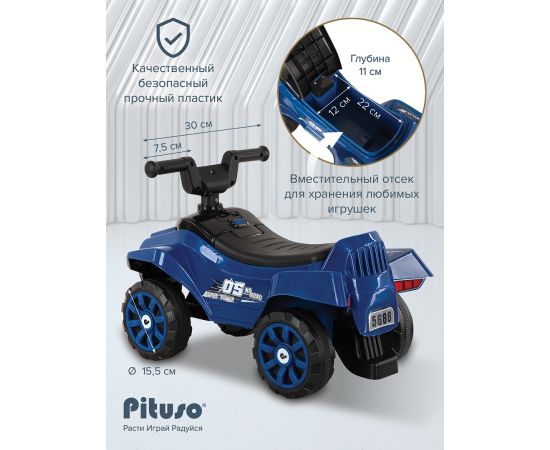 Модель выполнена в форме квадроцикла, имеет большие колеса с рисунком на шинах и просторное сиденье для комфортной посадки.