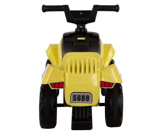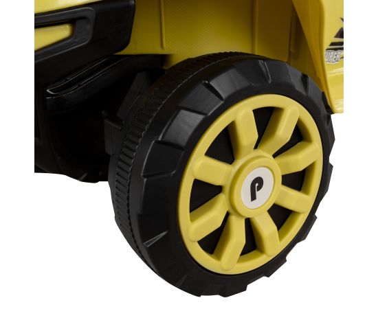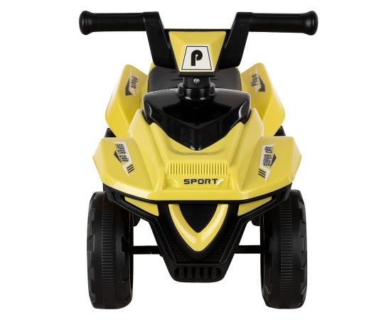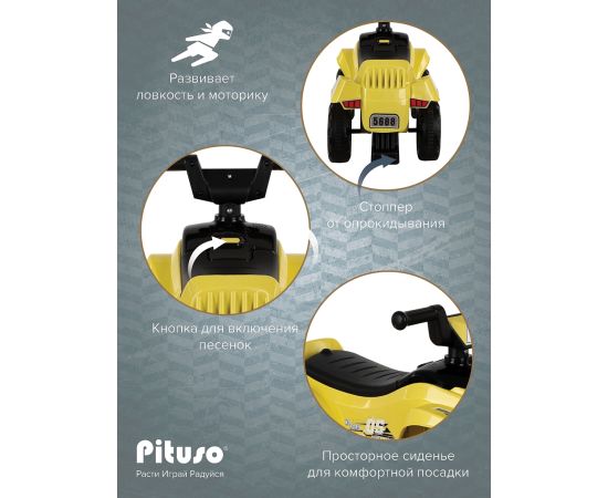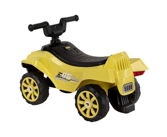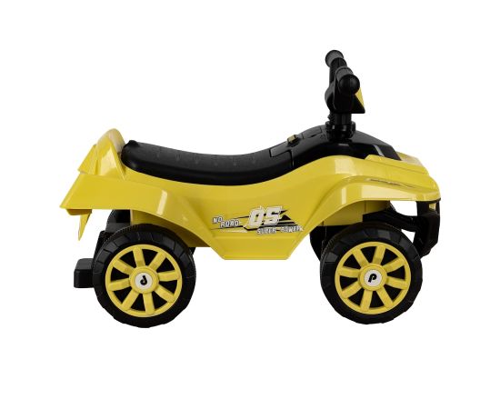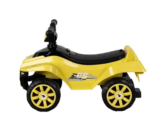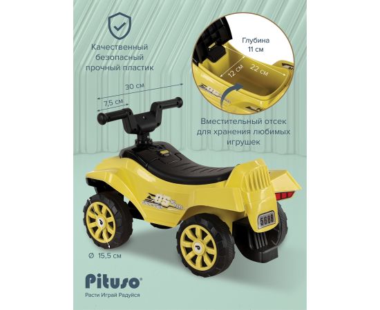 Модель выполнена в форме квадроцикла, имеет большие колеса с рисунком на шинах и просторное сиденье для комфортной посадки.