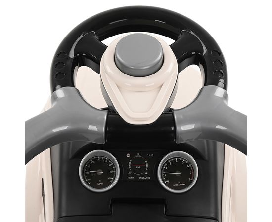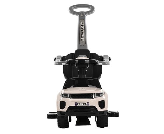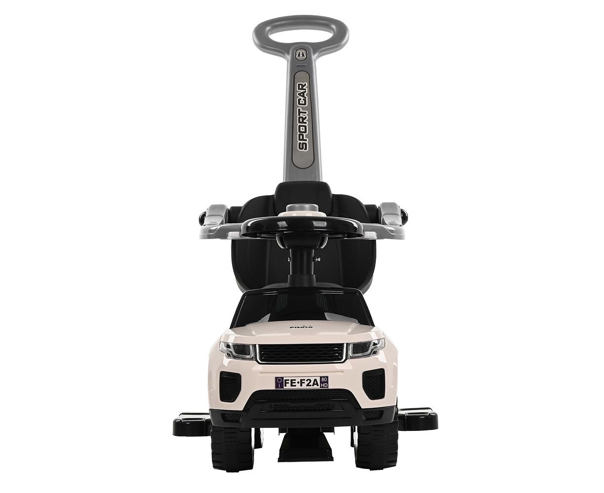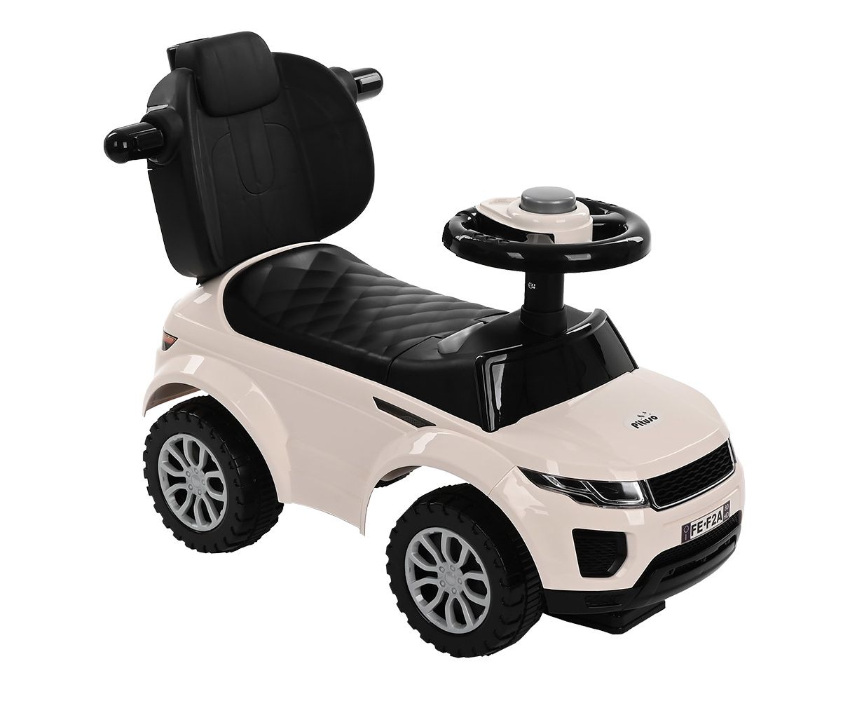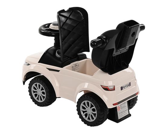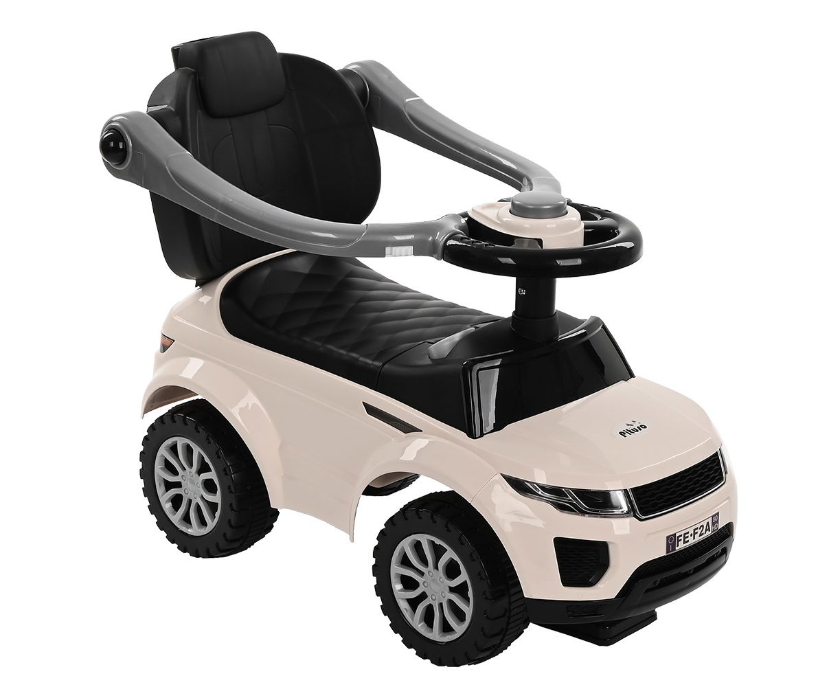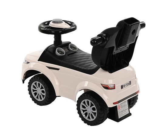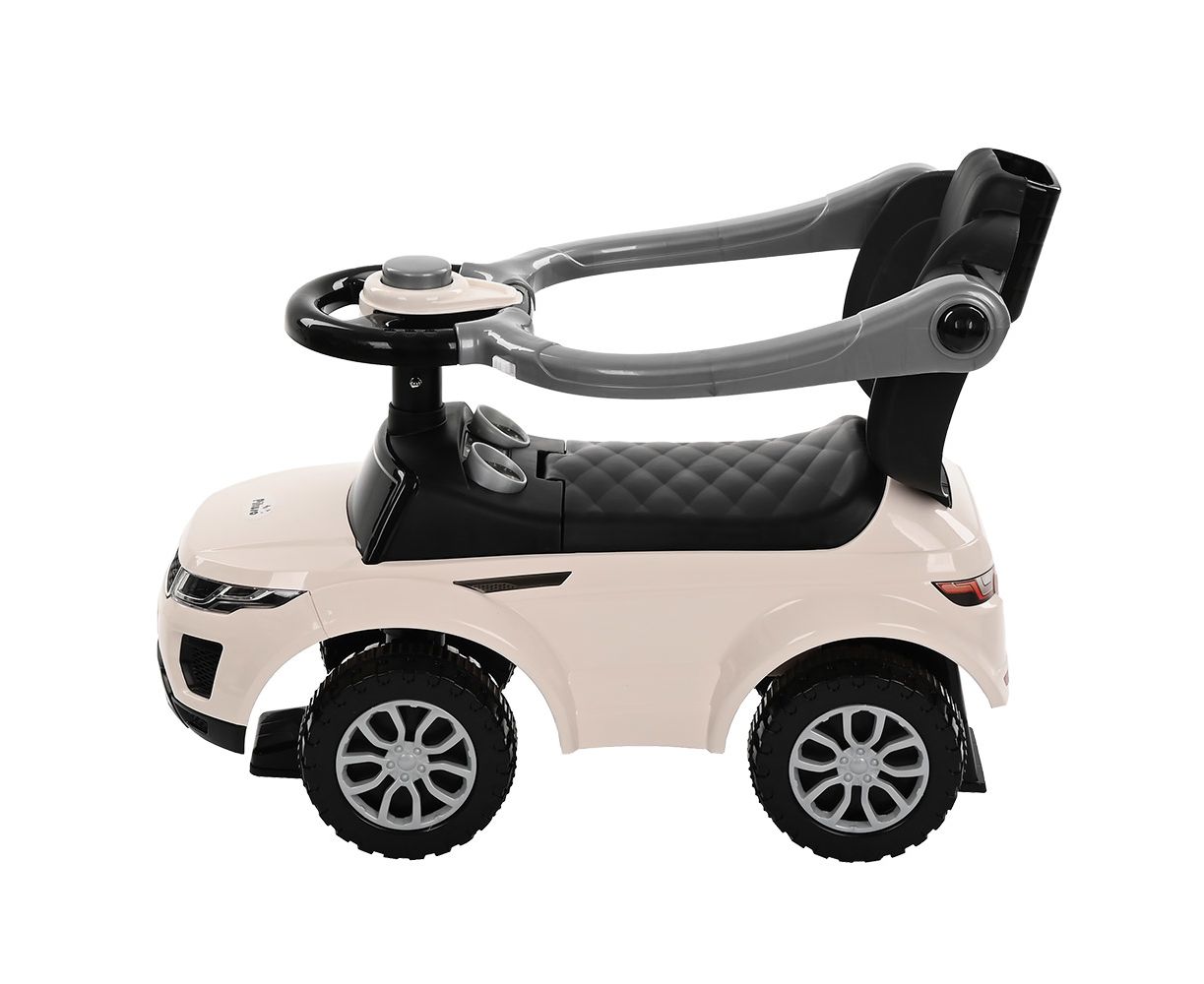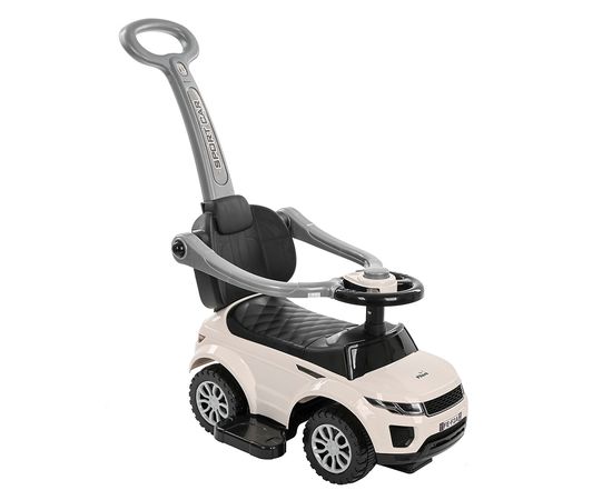 Модель выполнена в форме Range Rover, имеет пластиковые колеса и просторное сиденье для комфортной посадки. На руле расположен клаксон. Под сиденьем есть вместительный отсек для хранения любимых игрушек. Специальный стопор сзади защитит каталку от опрокидывания.