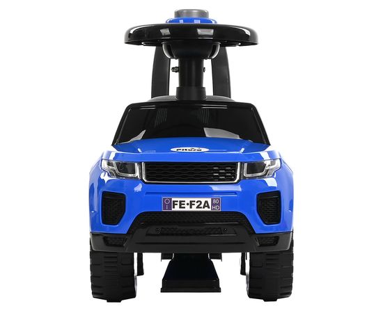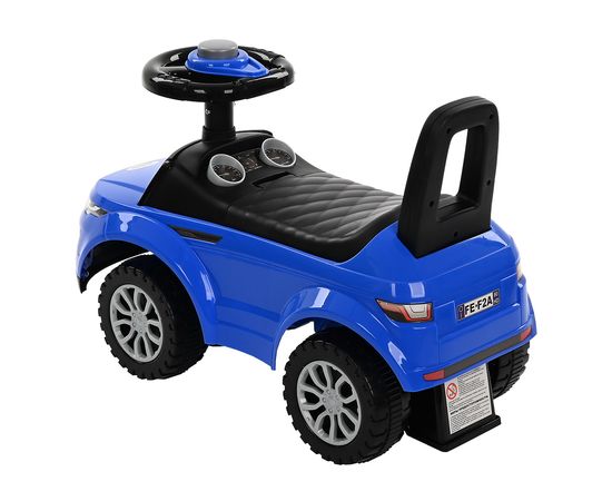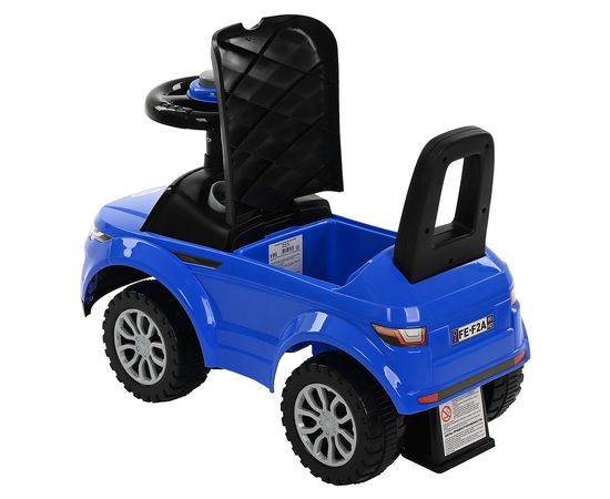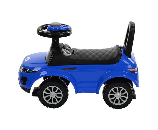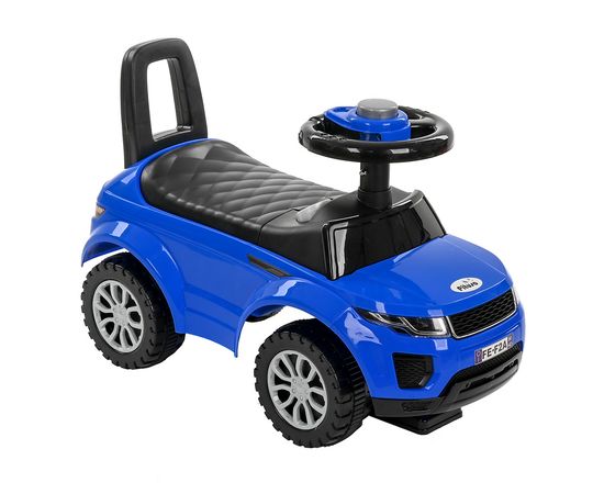 Модель выполнена в форме Range Rover, имеет пластиковые колеса и просторное сиденье для комфортной посадки. На руле расположен клаксон. Под сиденьем есть вместительный отсек для хранения любимых игрушек. Специальный стопор сзади защитит каталку от опрокидывания.