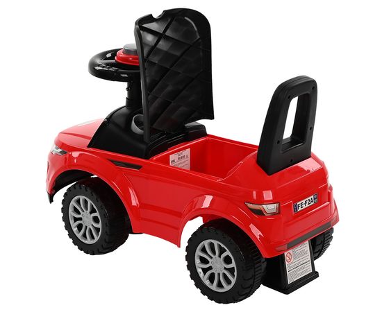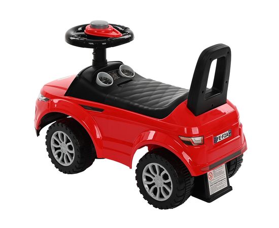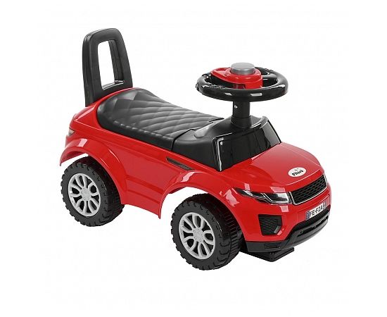 Модель выполнена в форме Range Rover, имеет пластиковые колеса и просторное сиденье для комфортной посадки. На руле расположен клаксон. Под сиденьем есть вместительный отсек для хранения любимых игрушек. Специальный стопор сзади защитит каталку от опрокидывания.