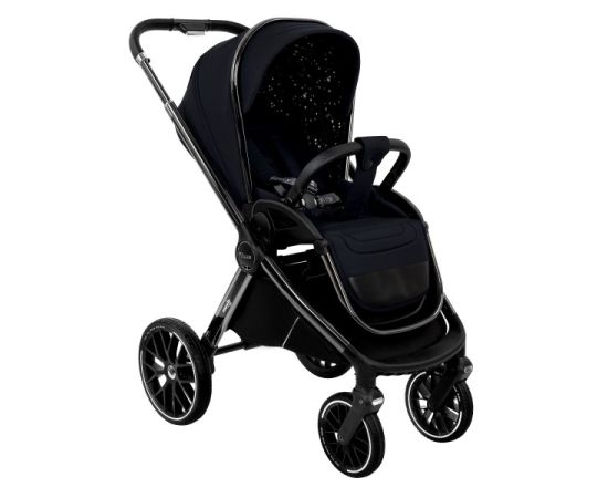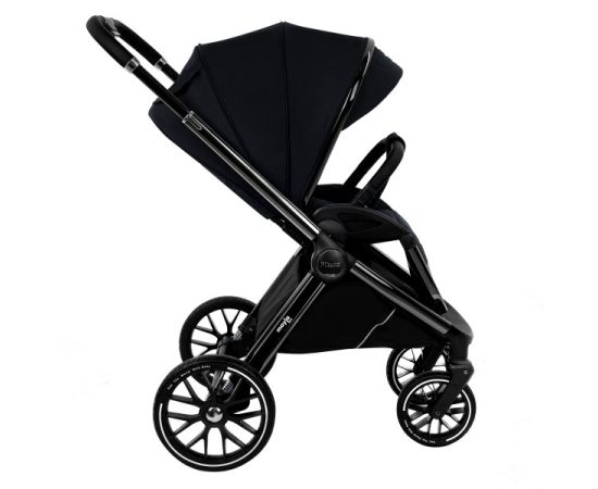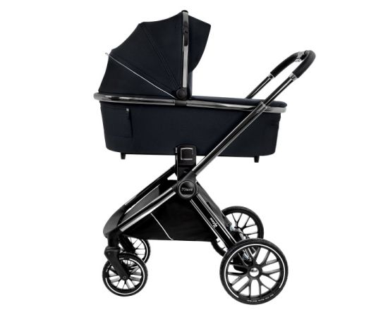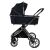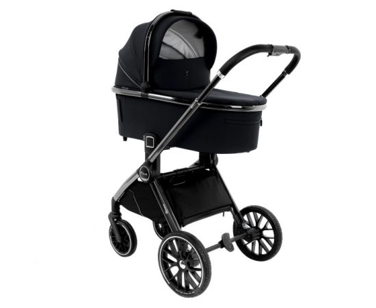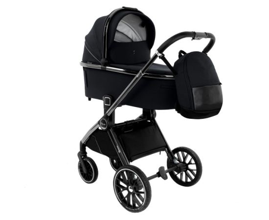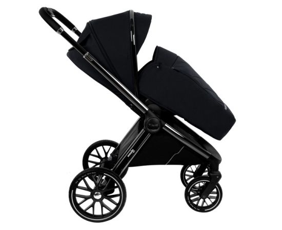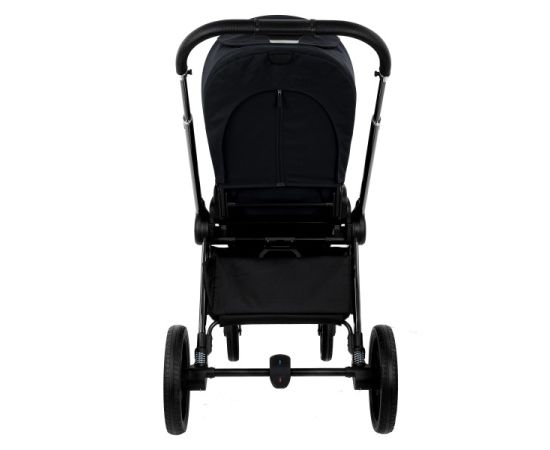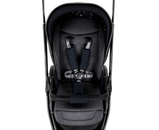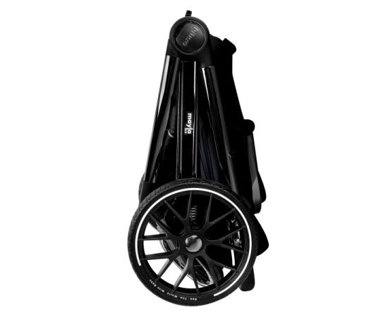 - Рама из облегченного алюминия с покрытием Black Chrome имеет повышенную износостойкость и компактно складывается по типу "книжки" вместе с прогулочным блоком.