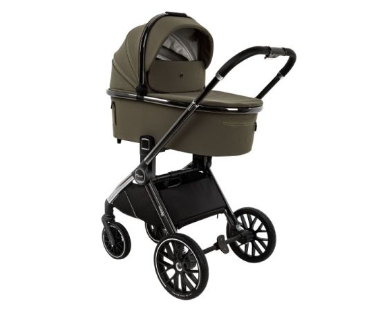 - Рама из облегченного алюминия с покрытием Black Chrome имеет повышенную износостойкость и компактно складывается по типу "книжки" вместе с прогулочным блоком.