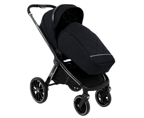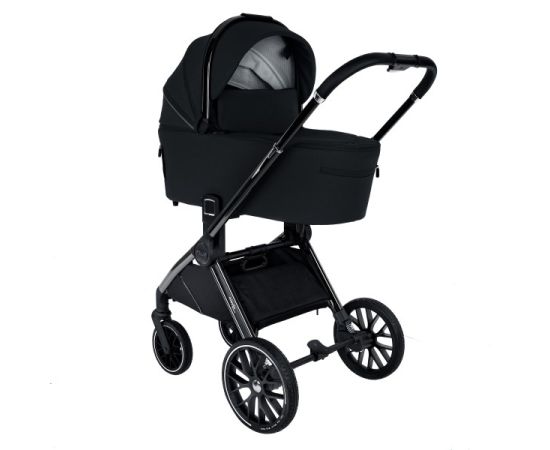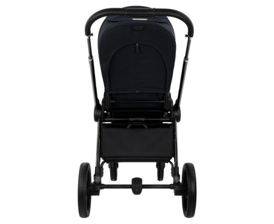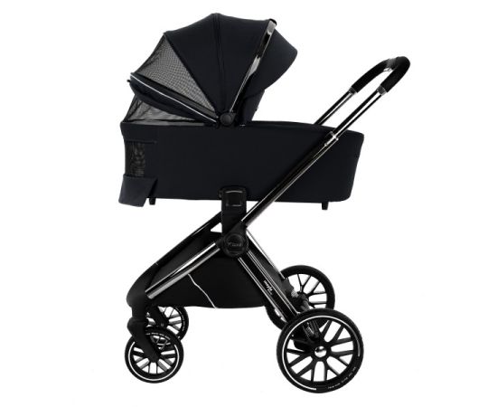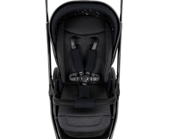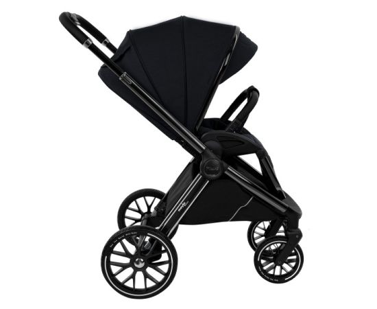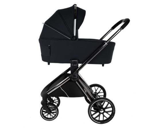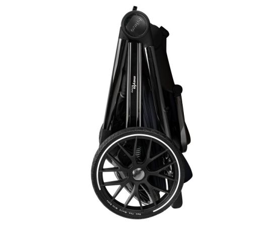 - Рама из облегченного алюминия с покрытием Black Chrome имеет повышенную износостойкость и компактно складывается по типу "книжки" вместе с прогулочным блоком.