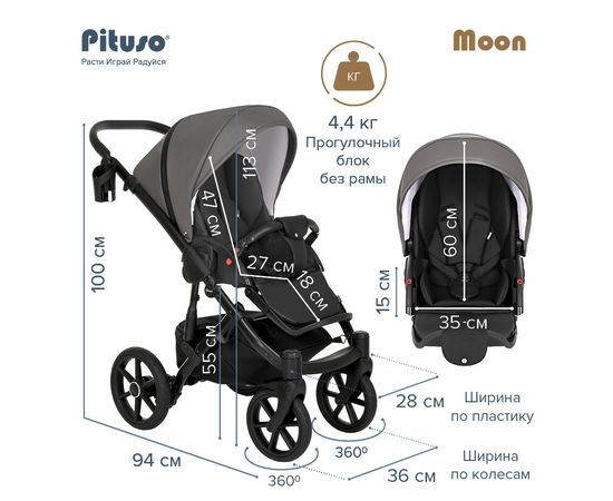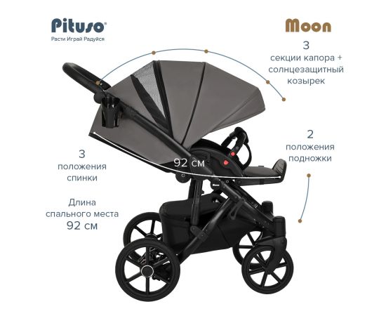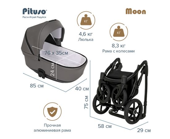 Коляска PITUSO MOON -Новая облегченная люлька из инновационного композитного материала, который обеспечивает отличную термо- и звукоизоляцию, и при этом обладает весом 4,6 кг. Прогулочный блок коляски MOON имеет удлиненную подножку, увеличенный капюшон. Неоспоримым преимуществом данной модели коляски является возможность раму (шасси) коляски сложить вместе с прогулочным блоком, что облегчает транспортировку.
