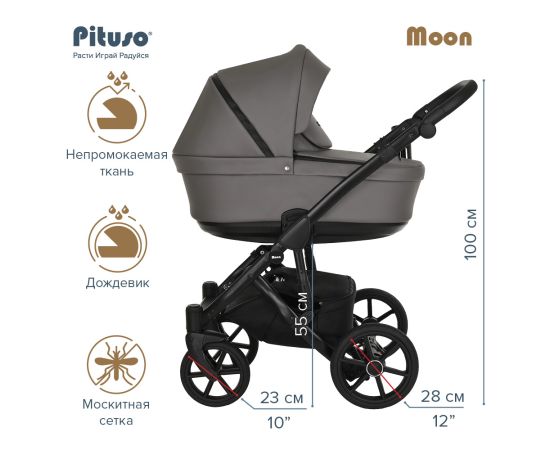 Коляска PITUSO MOON -Новая облегченная люлька из инновационного композитного материала, который обеспечивает отличную термо- и звукоизоляцию, и при этом обладает весом 4,6 кг. Прогулочный блок коляски MOON имеет удлиненную подножку, увеличенный капюшон. Неоспоримым преимуществом данной модели коляски является возможность раму (шасси) коляски сложить вместе с прогулочным блоком, что облегчает транспортировку.