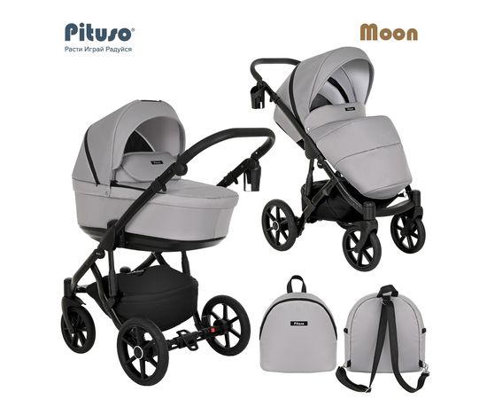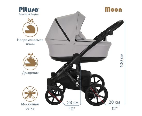 Коляска PITUSO MOON -Новая облегченная люлька из инновационного композитного материала, который обеспечивает отличную термо- и звукоизоляцию, и при этом обладает весом 4,6 кг. Прогулочный блок коляски MOON имеет удлиненную подножку, увеличенный капюшон. Неоспоримым преимуществом данной модели коляски является возможность раму (шасси) коляски сложить вместе с прогулочным блоком, что облегчает транспортировку.