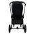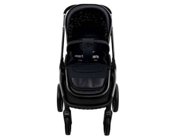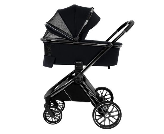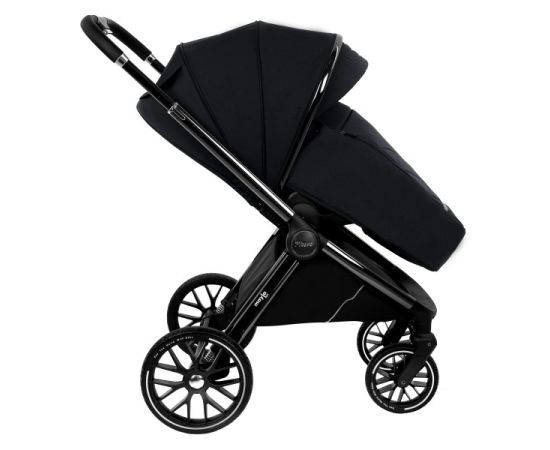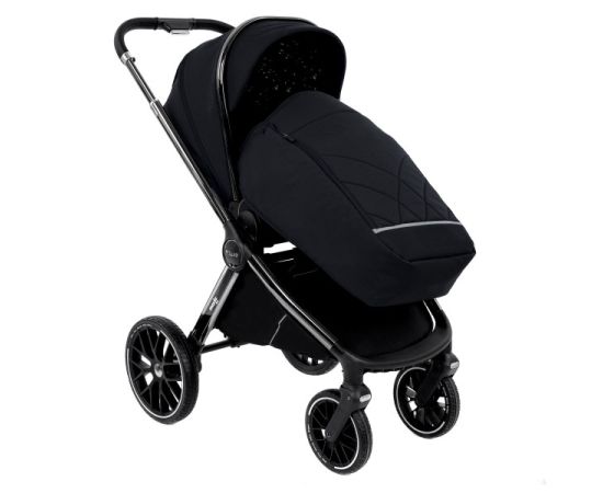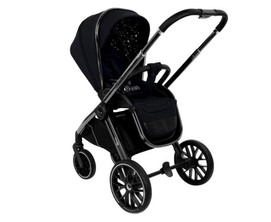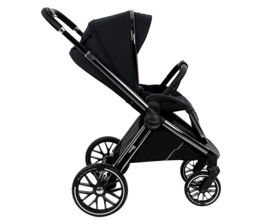 - Рама из облегченного алюминия с покрытием Black Chrome имеет повышенную износостойкость и компактно складывается по типу "книжки" вместе с прогулочным блоком.