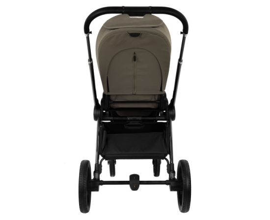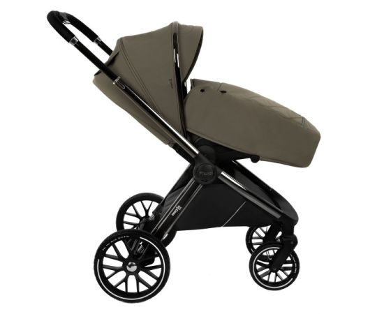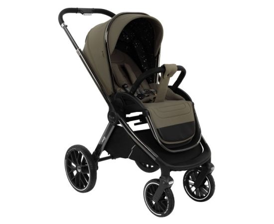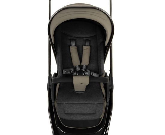 - Рама из облегченного алюминия с покрытием Black Chrome имеет повышенную износостойкость и компактно складывается по типу "книжки" вместе с прогулочным блоком.