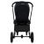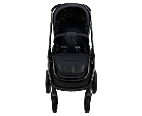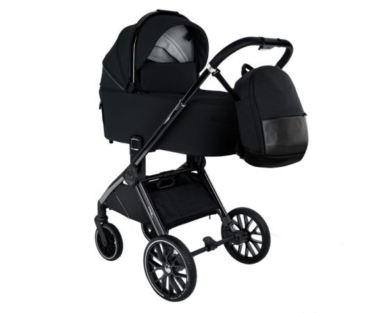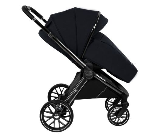- Рама из облегченного алюминия с покрытием Black Chrome имеет повышенную износостойкость и компактно складывается по типу "книжки" вместе с прогулочным блоком.