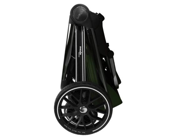 - Рама из облегченного алюминия с покрытием Black Chrome имеет повышенную износостойкость и компактно складывается по типу "книжки" вместе с прогулочным блоком.