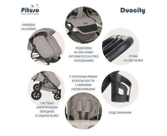 PITUSO Коляска детская DUOCITY для двойни (прогулочная), Black/Черный/чехол на ножки/AIR — комфортная и практичная прогулочная коляска для двоих детей от 7 месяцев и до 3-х лет. У коляски два сидения с индивидуальными настройками спинки, подножки и капора. Коляска имеет удобный капор, оснащенный дополнительной секцией и козырьком от солнца. На капоре предусмотрено окошко для вентиляции и обзора.