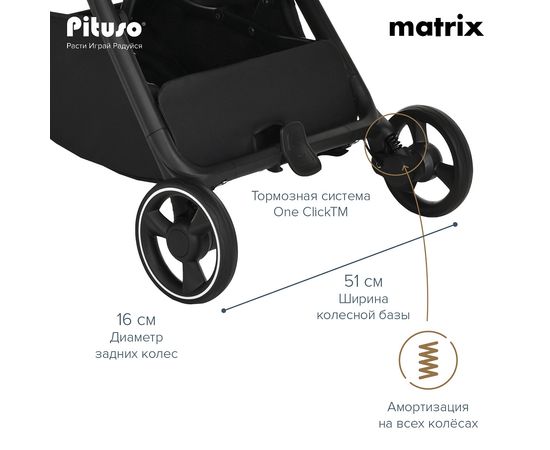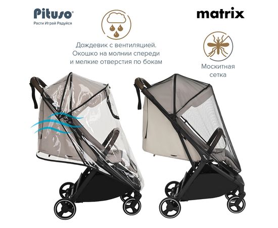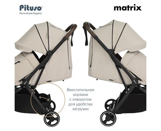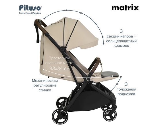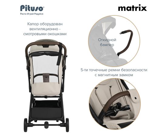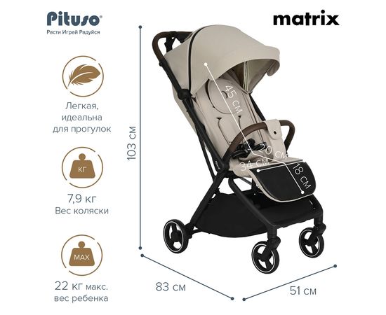 Встречайте MATRIX - самая легкая коляска PITUSO. Это удобная, гибкая и надежная городская коляска, которая едет невероятно мягко и плавно. Легкое маневрирование достигается благодаря небольшим колесам с поворотом на 360 градусов, и даже самые активные маленькие путешественники смогут качественно отдохнуть благодаря раскладывающейся спинке и уютной подставке для ног, что создает как бы оазис для комфортных прогулок.