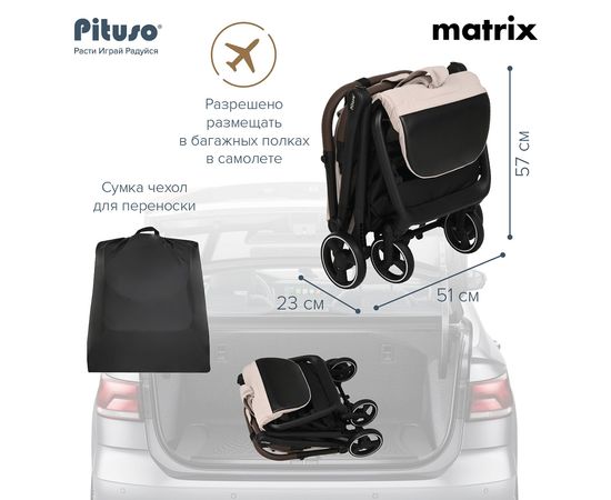 Ультра легкая и компактная коляска Pituso Matrix поможет вам гулять плавно и быстро - это идеальная коляска для тех, кто любит движение и маневренность. Продвинутые инженерные решения позволяют вам пользоваться коляской с легкостью и удовольствием. У заядлых путешественников и энтузиастов будет возможность упаковать в дорожную сумку для удобной транспортировки или хранения.