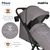 • Передние колеса легко вращаются вокруг своей оси под углом 360 градусов. Они обеспечивают шасси дополнительную маневренность, значительно облегчая родителям поездку между полками магазинов.
