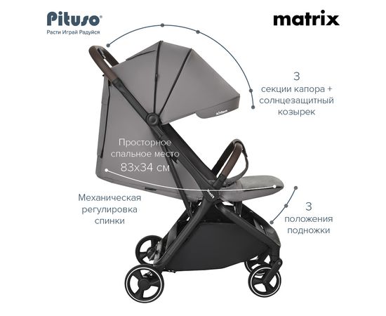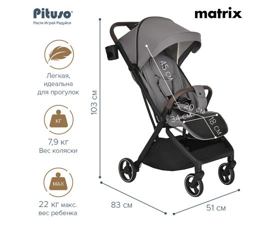 Встречайте MATRIX - самая легкая коляска PITUSO. Это удобная, гибкая и надежная городская коляска, которая едет невероятно мягко и плавно. Легкое маневрирование достигается благодаря небольшим колесам с поворотом на 360 градусов, и даже самые активные маленькие путешественники смогут качественно отдохнуть благодаря раскладывающейся спинке и уютной подставке для ног, что создает как бы оазис для комфортных прогулок.