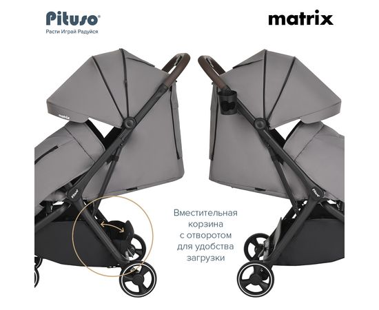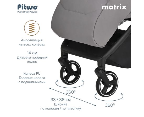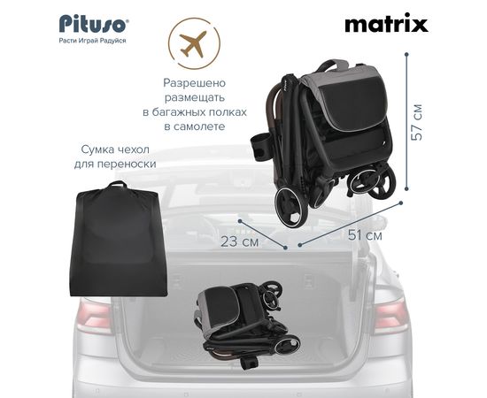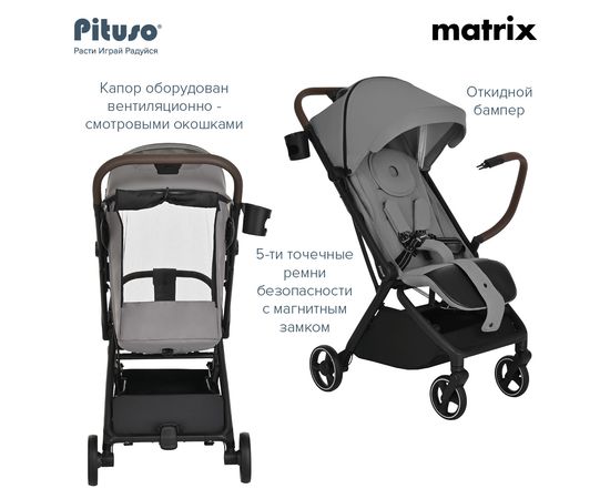 Ультра легкая и компактная коляска Pituso Matrix поможет вам гулять плавно и быстро - это идеальная коляска для тех, кто любит движение и маневренность. Продвинутые инженерные решения позволяют вам пользоваться коляской с легкостью и удовольствием. У заядлых путешественников и энтузиастов будет возможность упаковать в дорожную сумку для удобной транспортировки или хранения.