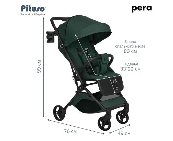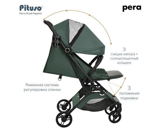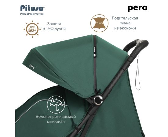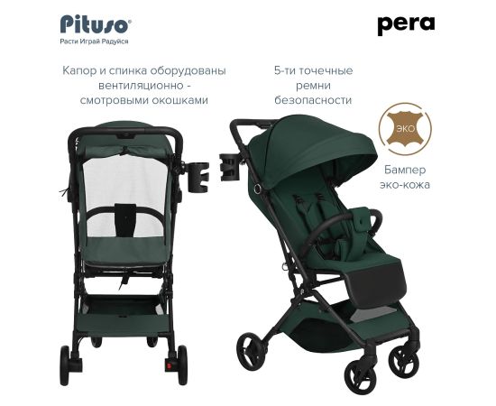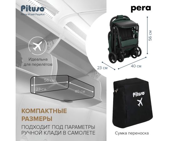 Новая версия стильной, маневренной и легкой (5.7 кг) прогулочной коляски PITUSO PERA идеально подходит не только для прогулок, но и путешествий. Складываясь одной рукой до очень компактных размеров, коляска подходит под параметры ручной клади в самолете.