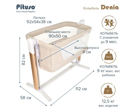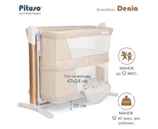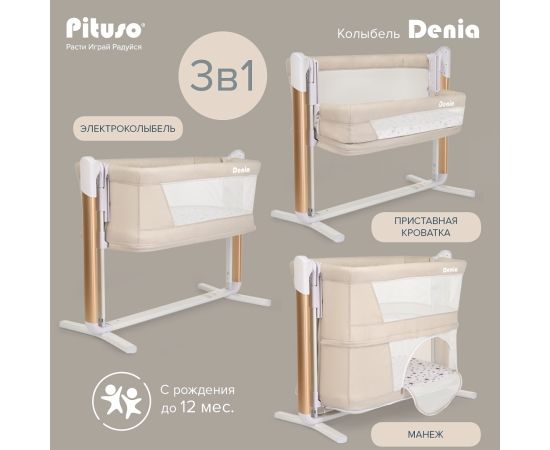 Колыбель Pituso Denia сочетает в себе сразу 3 функции: приставная кроватка, электроколыбель и манеж. Предназначена для детей с первых дней жизни до достижения веса 9 кг и до достижения веса 12 кг используется в качестве манежа.