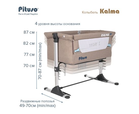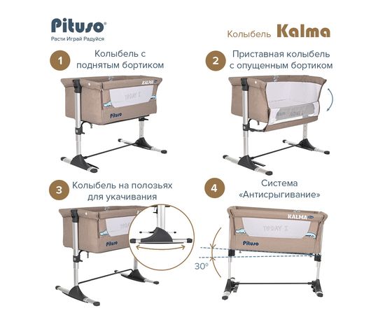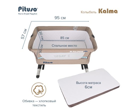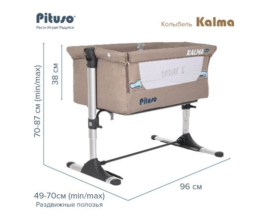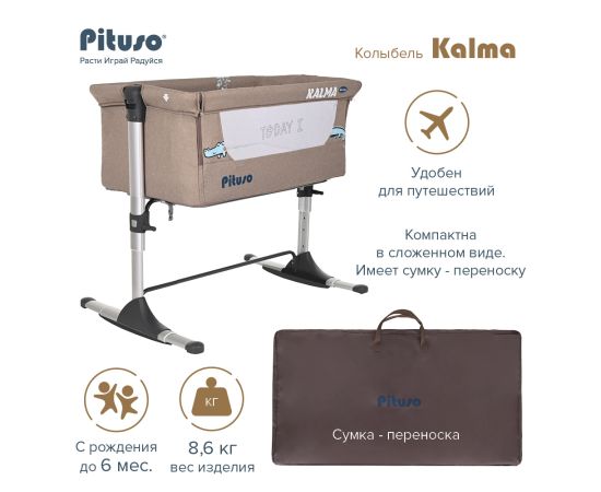 Приставная колыбель-трансформер PITUSO KALMA имеет безопасную систему крепления к кровати родителей и позволяет вам спать рядом с малышом. Уникальная связь между малышом и родителями будет еще сильнее, а ночи – спокойнее! С колыбелью PITUSO KALMA можно не беспокоиться о самочувствии младенца по ночам, ведь теперь вы сможете покормить и успокоить малыша, когда бы он ни проснулся.