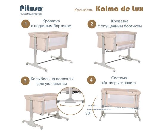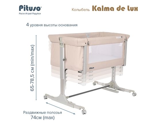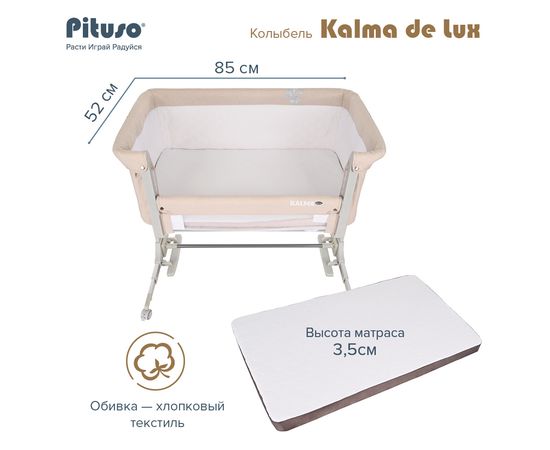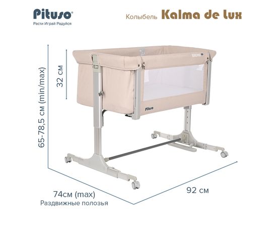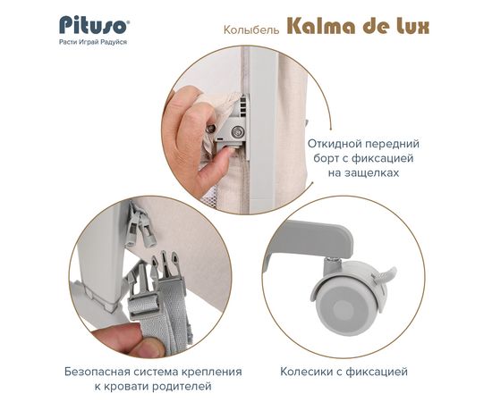 Приставная колыбель-трансформер PITUSO KALMA DELUX имеет безопасную систему крепления к кровати родителей и позволяет вам спать рядом с малышом. Уникальная связь между малышом и родителями будет еще сильнее, а ночи – спокойнее!