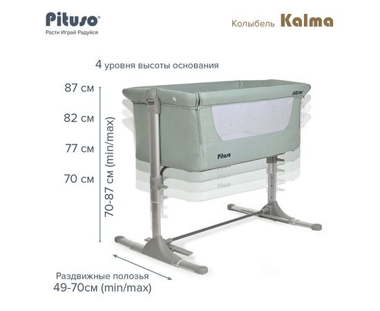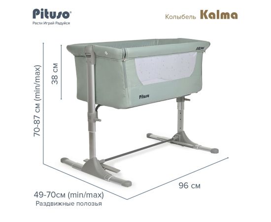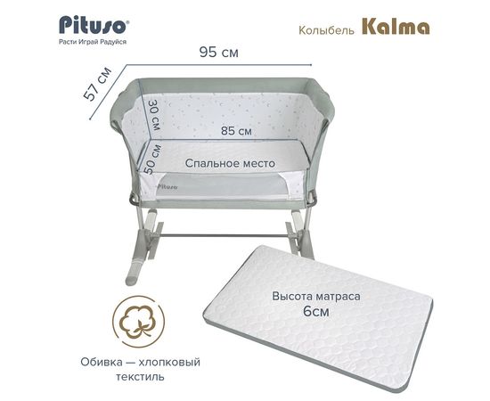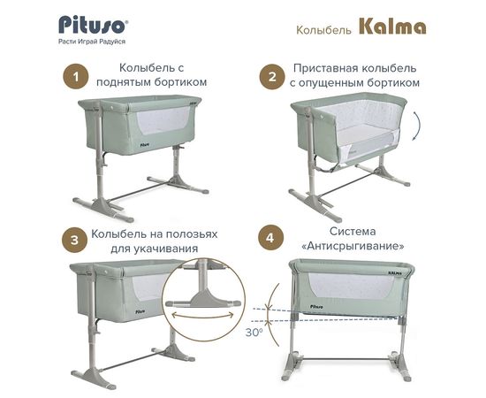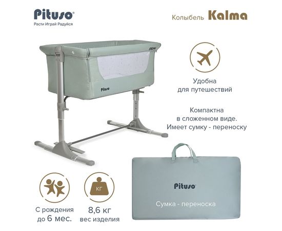 Приставная колыбель-трансформер PITUSO KALMA имеет безопасную систему крепления к кровати родителей и позволяет вам спать рядом с малышом. Уникальная связь между малышом и родителями будет еще сильнее, а ночи – спокойнее! С колыбелью PITUSO KALMA можно не беспокоиться о самочувствии младенца по ночам, ведь теперь вы сможете покормить и успокоить малыша, когда бы он ни проснулся.