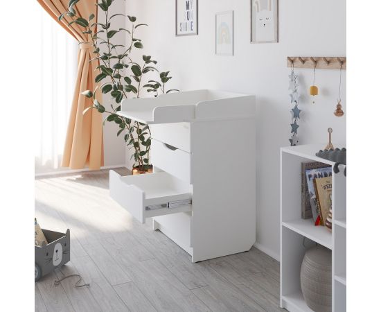Эргономичный пеленальный комод. "Мягкая" форма фасадов (мдф) с логотипом в 3D-исполнении. Корпус комода выполнен из ЛДСП PREMIUM-класса с особенным объемным тиснением поверхности и современными, натуральными расцветками. Ящики комода оснащены телескопическими направляющими, придающими плавность и бесшумность хода.