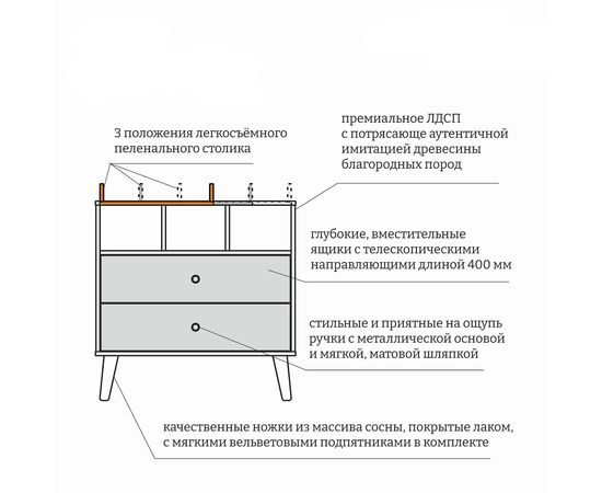 Ножки комода выполнены из массива сосны и покрыты безопасным лаком. В комплекте к ножкам есть мягкие фетровые подпятники, для защиты пола.