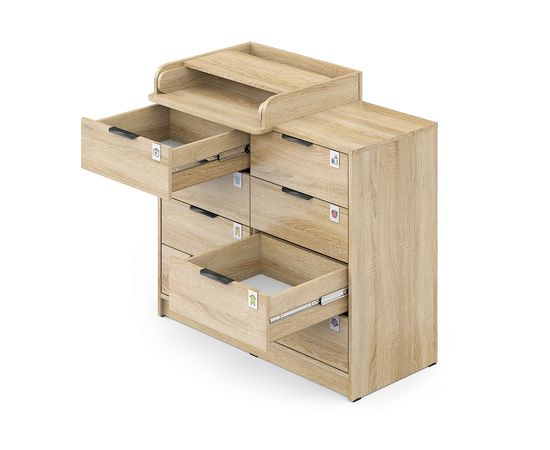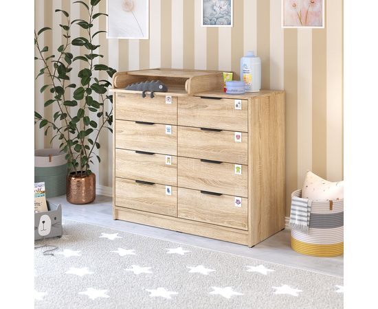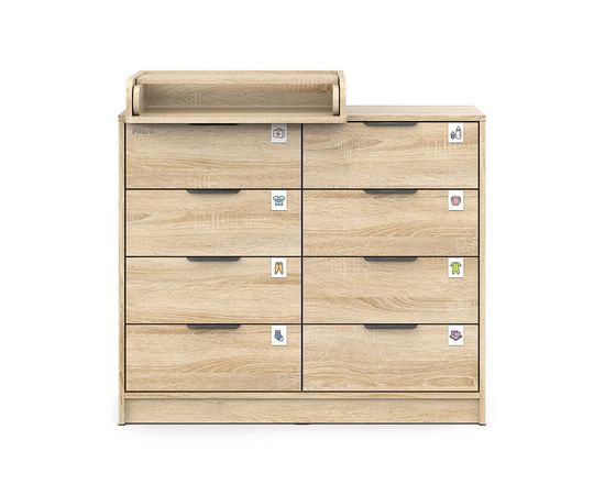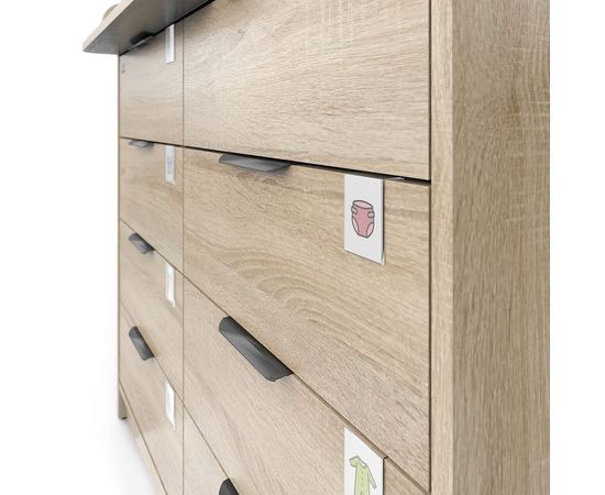 В комплекте с комодом идут специальные прозрачные пластиковые шильдики, которые, при желании, одеваются сверху на фасад. В них можно вставить любые картинки или рисунки. Базовый набор ярлычков-картинок принадлежностей для новорожденных в комплекте.